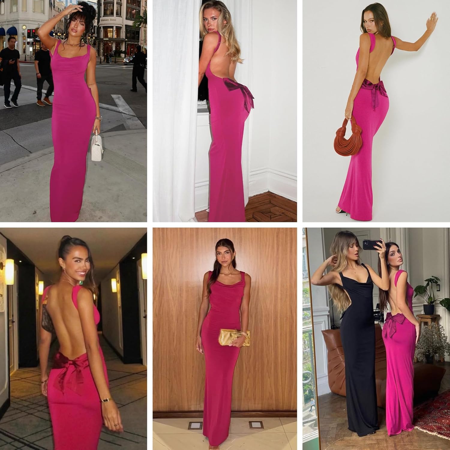 3) This sexy maxi dress features one shoulder, sleeveless, backless, floor length, ruched back and metal O ring.