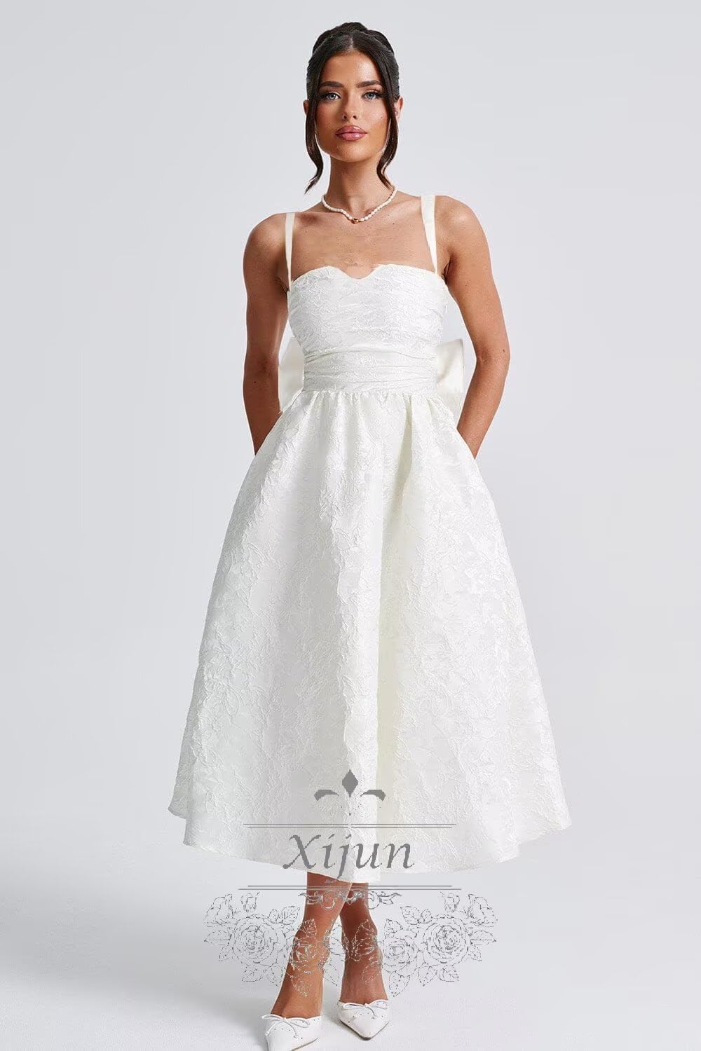 Xijun Satin Jacquard Prom Dresses with Bow Back Tea Length Corset Formal Party Gown for Teens