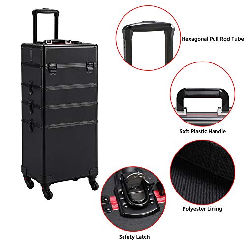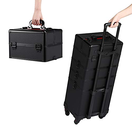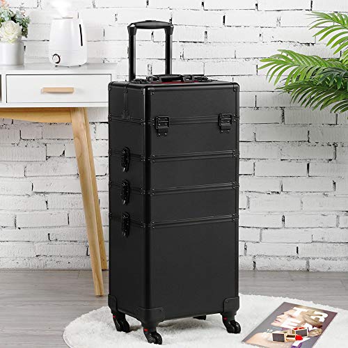 Yaheetech 4 in 1 Professional Makeup Train Case Aluminum Cosmetic Case Rolling Makeup Case Extra Large Trolley makeup travel organizer, with 360° Swivel Wheels, Black